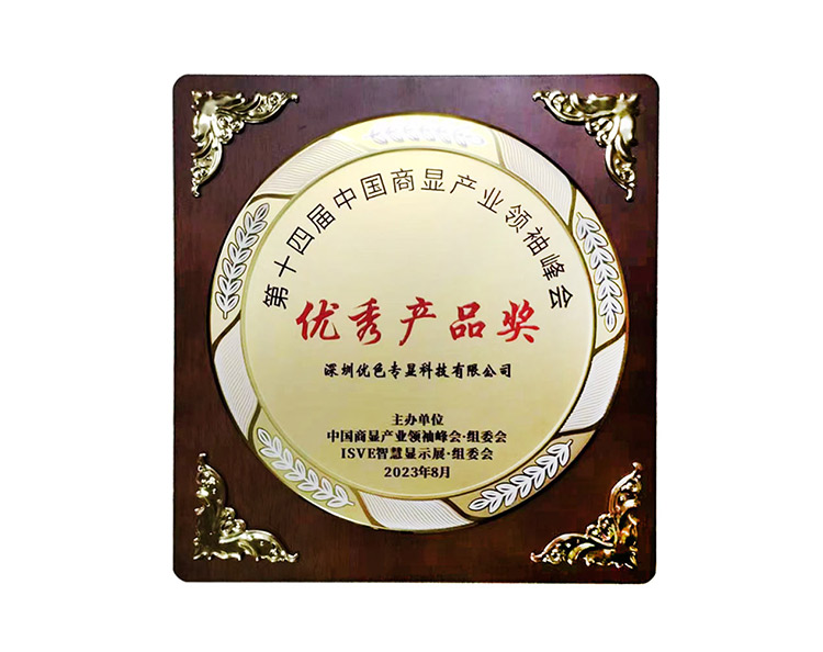 熱烈祝賀優(yōu)色專(zhuān)顯(xiǎn)在(zài)2023第十四屆深圳(國際)智慧(huì)顯示係統產(chǎn)業(yè)應用博覽會榮獲得優秀產(chǎn)品獎