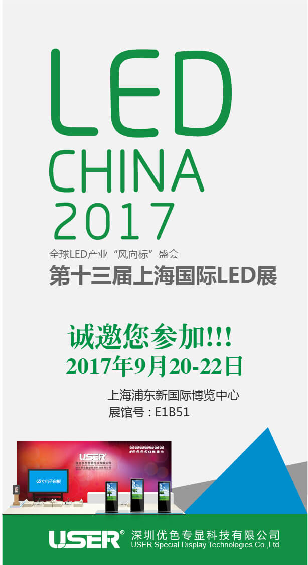 金秋九月,碩果累累,順應市場行情和公司發(fā)展需要,公(gōng)司將參加於(yú)2017920-22日在上海(hǎi)浦(pǔ)東新國際中心舉辦的第十(shí)三屆上海國際(jì)LED展,公司(sī)展位E1B51,屆時(shí)誠邀(yāo)蒞臨參觀!
