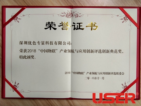 2018中國物聯網產業領航與應(yīng)用創新典範獎榮譽證書