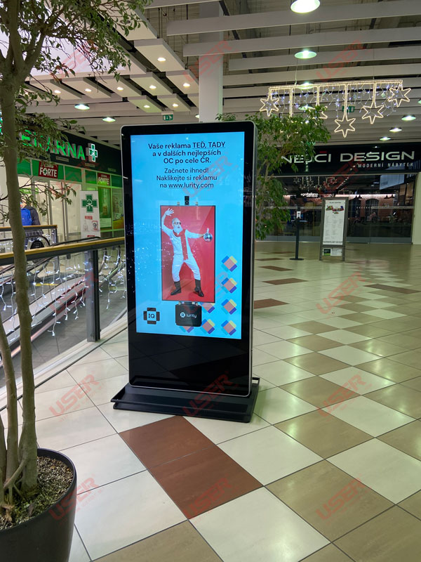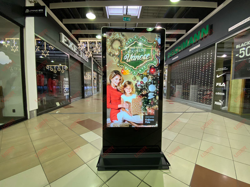 91视频网站(sè)專顯65寸雙麵(miàn)納米觸摸落地廣告機進(jìn)駐捷克某商場(chǎng)